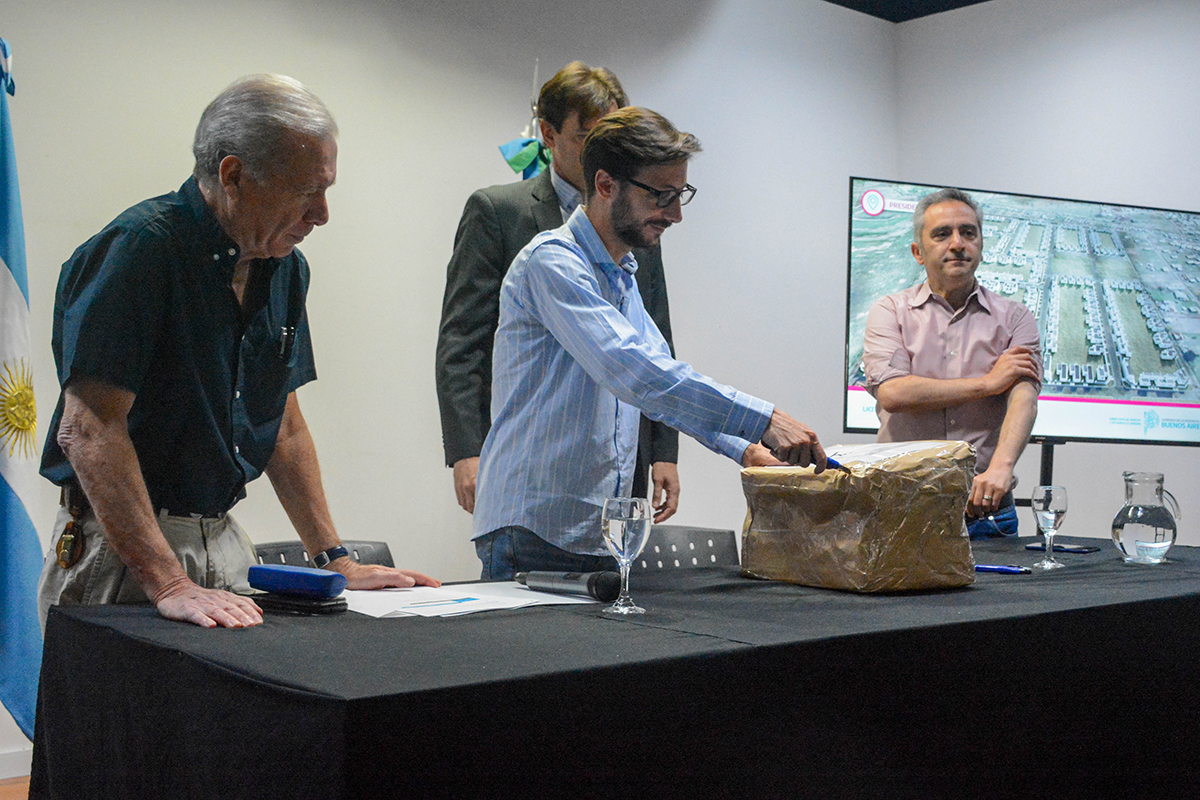 El ministro de Hábitat y Desarrollo Urbano, Agustín Simone, y el ministro de Desarrollo de la Comunidad, Andrés Larroque, encabezaron el acto de apertura de sobres para la construcción de las casas que se sumarán a las 160 que ya fueron licitadas en mayo último y están próximas a iniciarse.