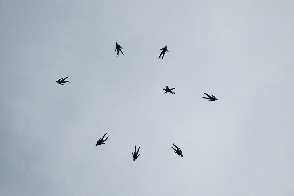 Demostración aérea del equipo de paracaidismo de las fuerzas armadas de Singapur.