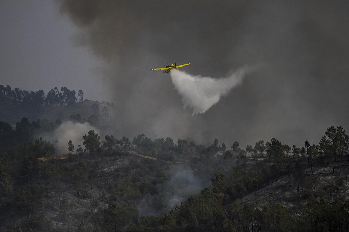 Un avión hidrante arroja agua sobre un incendio forestal en Portugal.