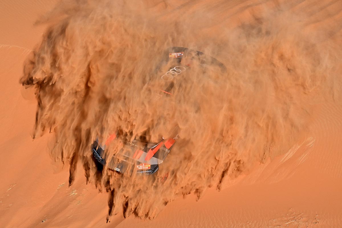 El Audi de Carlos Sainz queda envuelto en arena, durante la 6ta etapa del Dakar, disputado en Arabia Saudita.