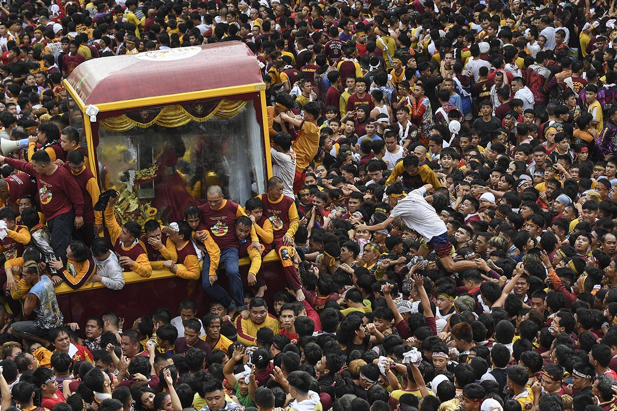 Un hombre corre por encima de la multitud para poder alcanzar la imagen del Nazareno Negro, durante una procesión religiosa en Manila.