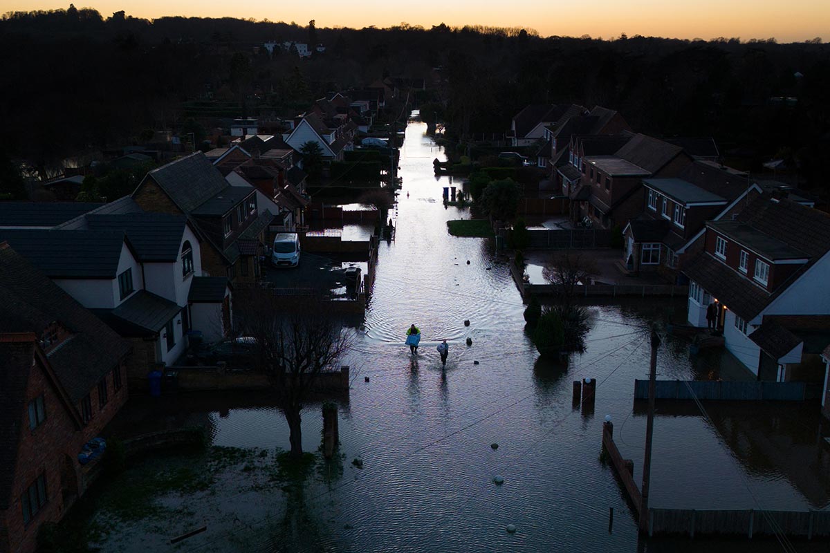 Dos personas caminan por un barrio inundado en Inglaterra, luego de fuertes lluvias.