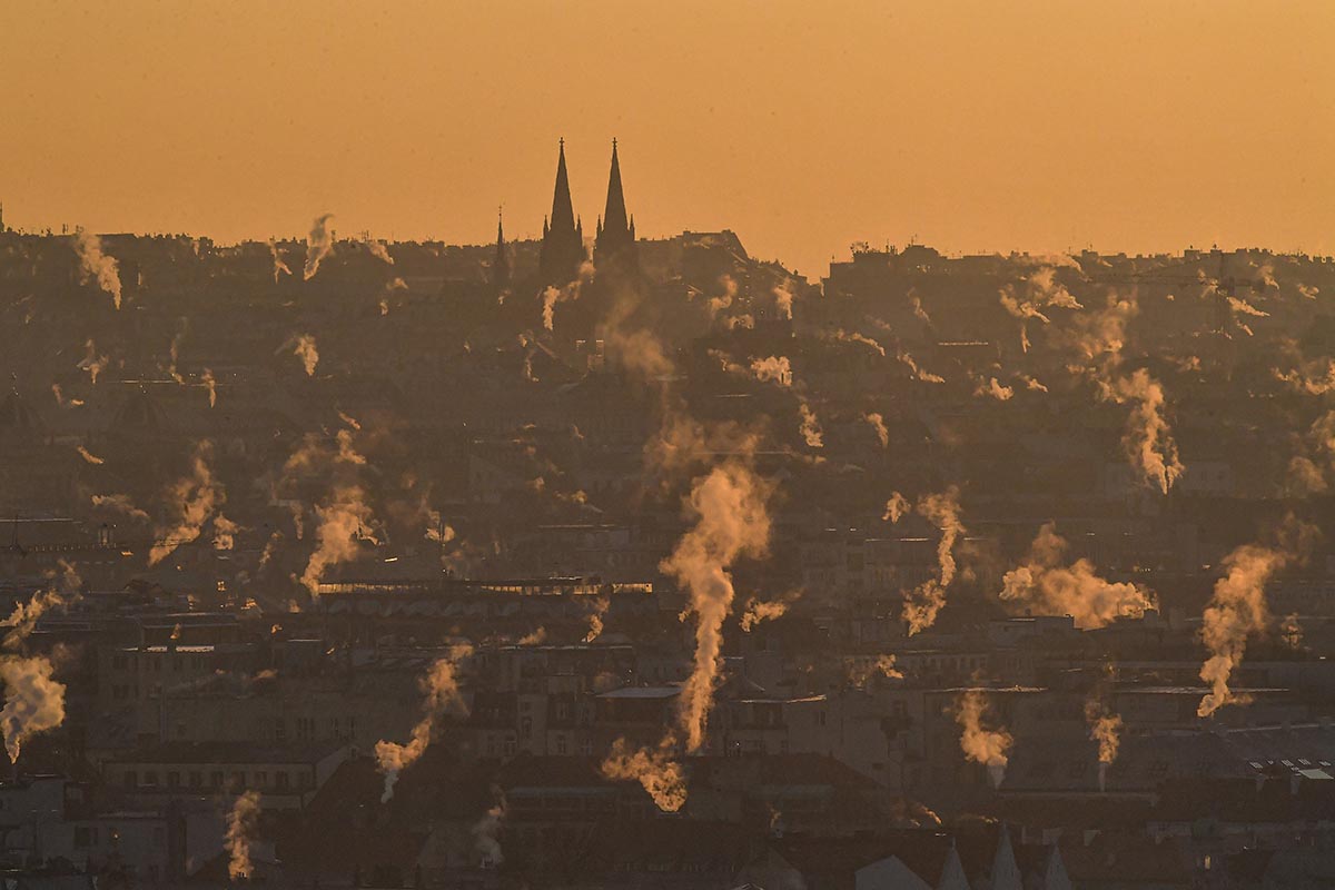 El humo se eleva de decenas de chimeneas prendidas en las terrazas de Praga, durante el crudo invierno que está azotando gran parte de Europa.