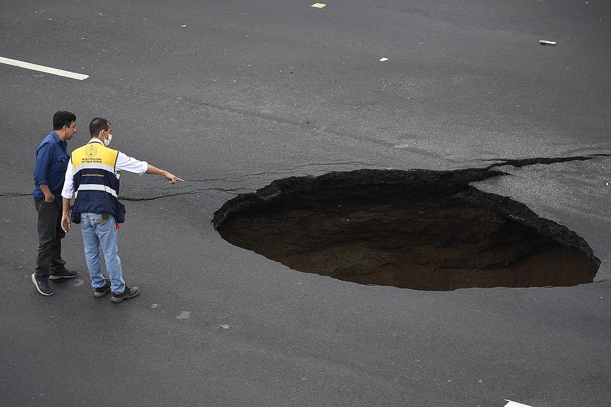 Dos empleados municipales observan un agujero en la ruta provocado por el colapso del sistema de drenaje.
