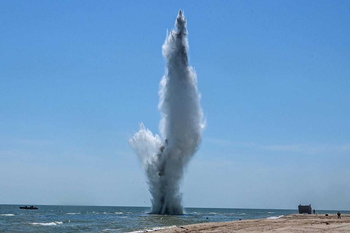 Tropas rusas explotan minas colocadas por el ejército ucraniano en la playa de Mariupol.