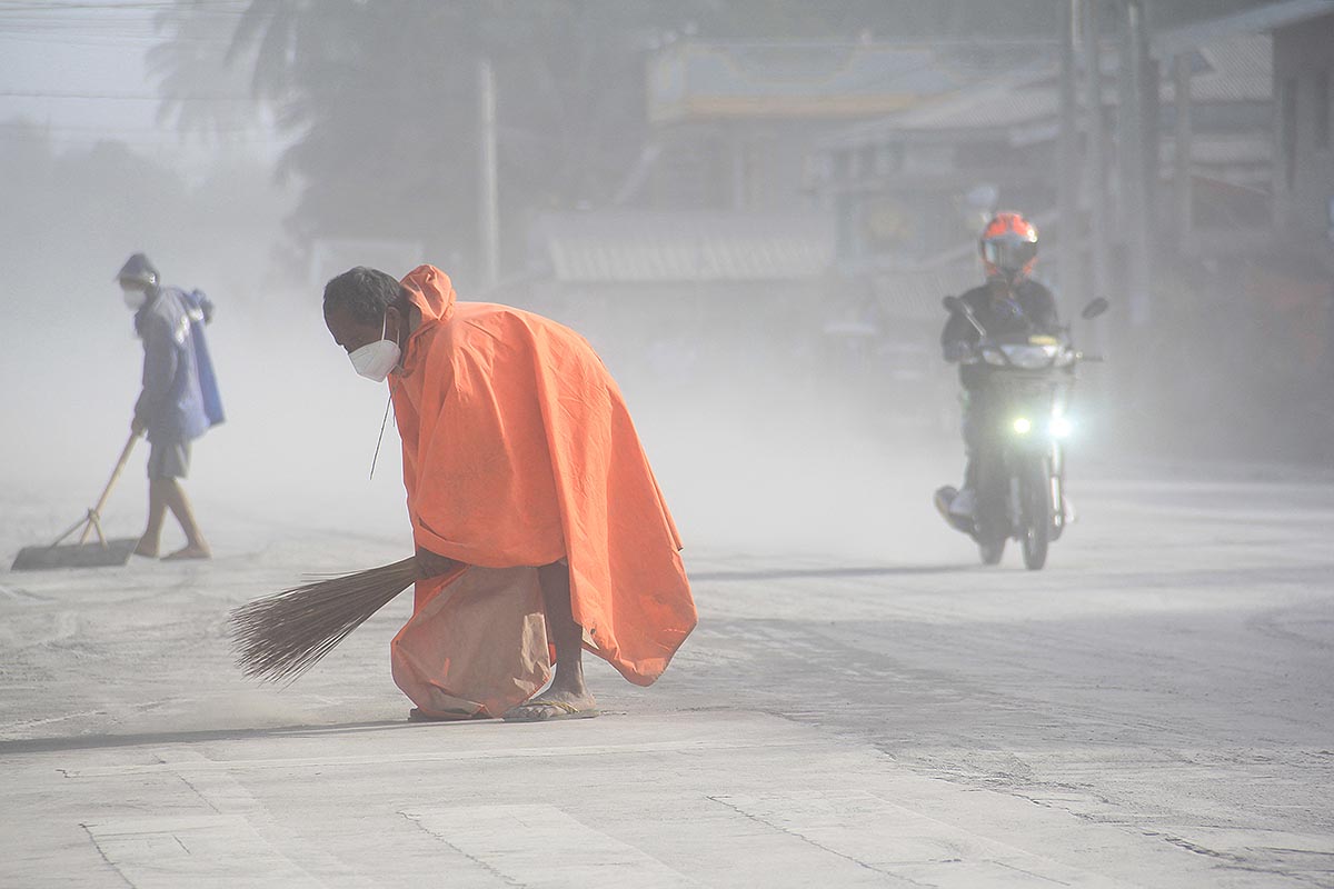 Trabajadores limpian las calles de cenizas después de la erupción del volcán Burusan en Filipinas.