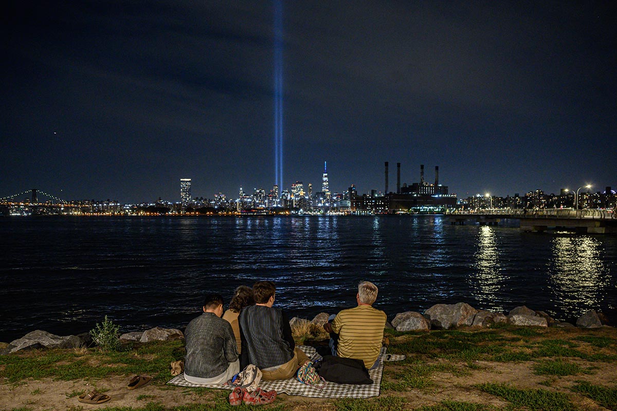 Un grupo de jóvenes observan las torres de luz erigidas donde se encontraban las Torres Gemelas, durante un nuevo aniversario del ataque.