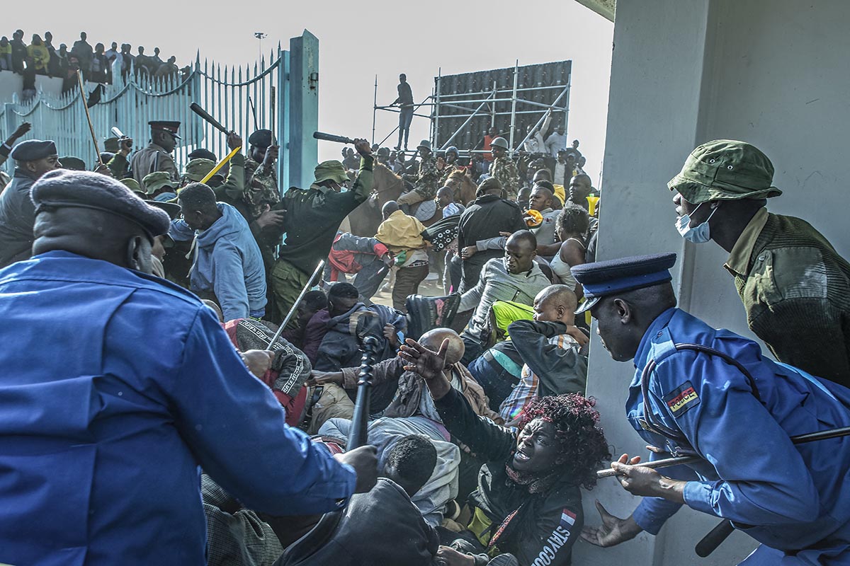 Una mujer pide ayuda a las fuerzas de seguridad mientras se produce una estampida y represión durante la ceremonia de asunción del presidente William Ruto en Kenia.