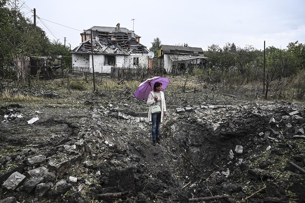 Una mujer parada en la puerta de sus casa observa el cráter producto de los bombardeos en la región de Donetsk, en Ucrania.