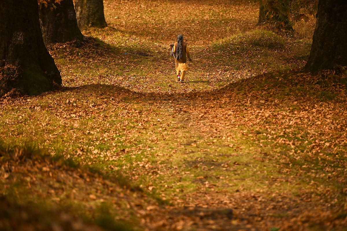 Una mujer camina en un bosque de árboles de Maple en India.