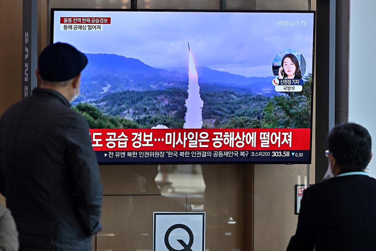 Dos personas ven por televisión el lanzamiento de prueba de un misil Norcoreano.