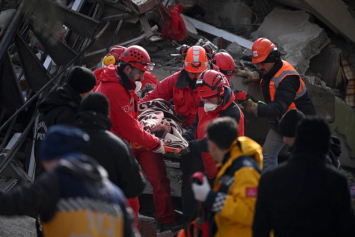 Rescatistas trasladan en camilla a una persona herida entre los escombros de un edificio destruido.