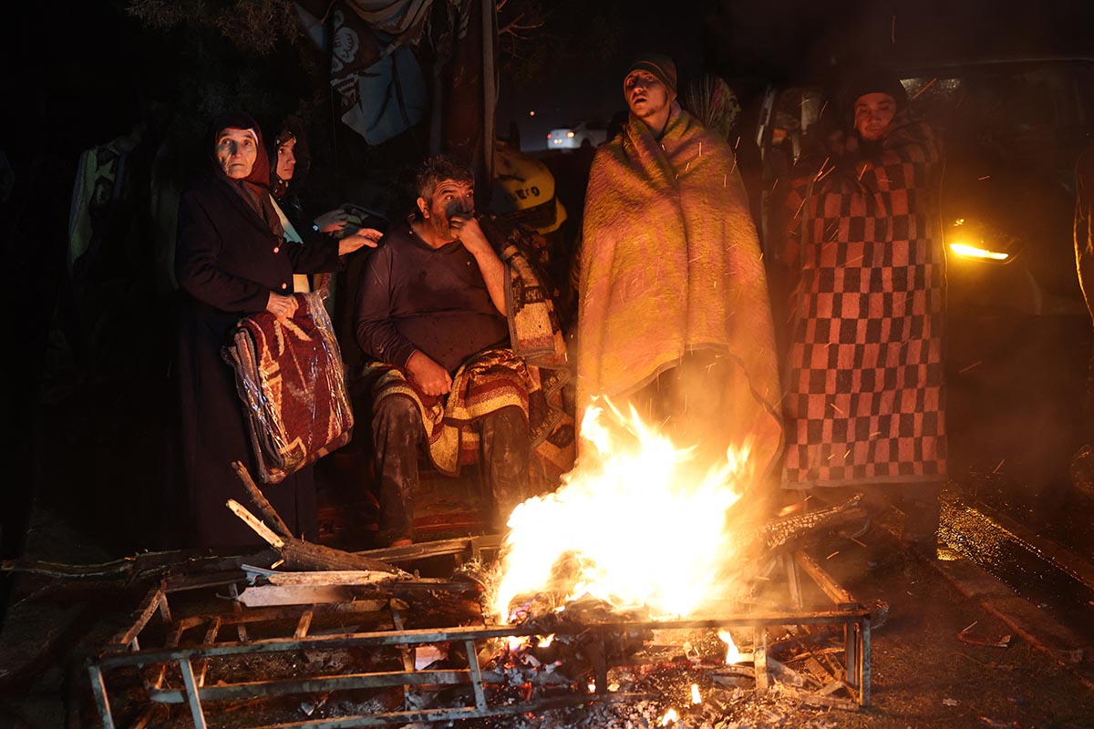 Sobrevivientes del terremoto se calientan al lado de un fuego durante el frío de la noche.