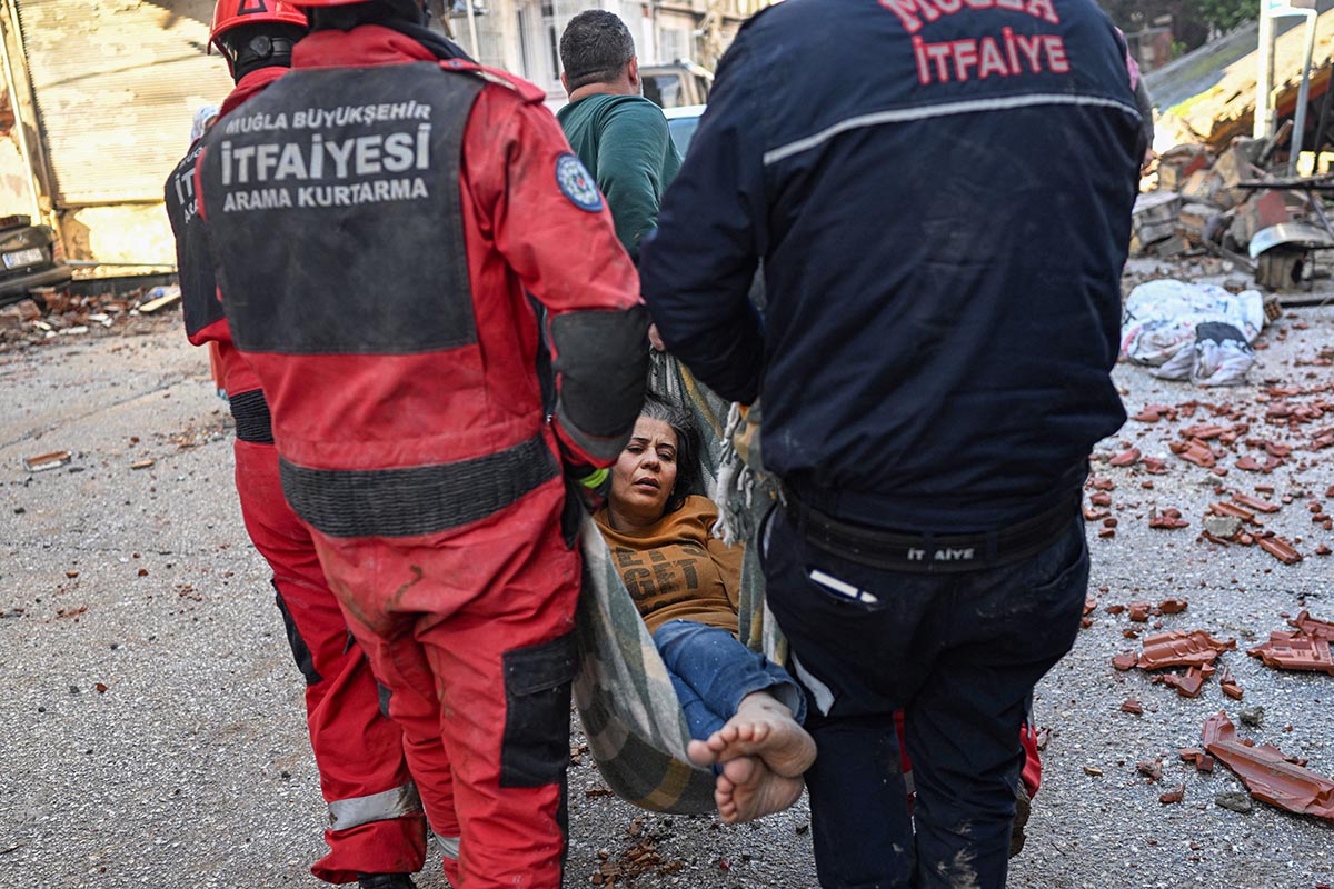 Una mujer herida es trasladada luego de ser rescatado entre las ruinas de su casa.