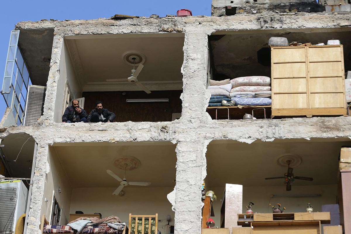 Dos hombres observan desde los restos de un edificio parcialmente destruido por el terremoto en Aleppo, Siria.