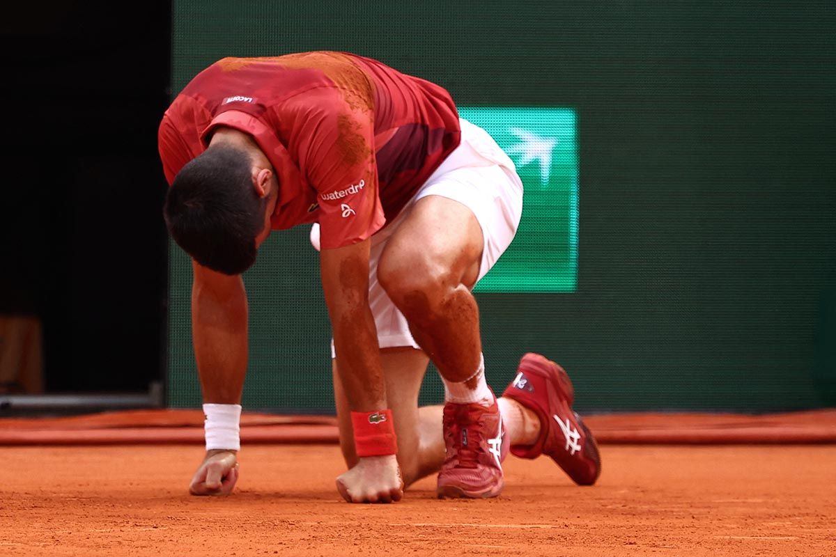 Novak Djokovic reacciona luego de caerse durante el partido contra el argentino Francisco Cerundolo en Roland Garros.