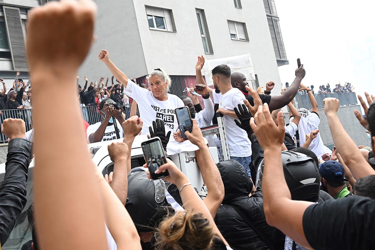La madre de Nahel, el joven asesinado por la policía en Francia, levanta su brazo acompañada por los manifestantes.