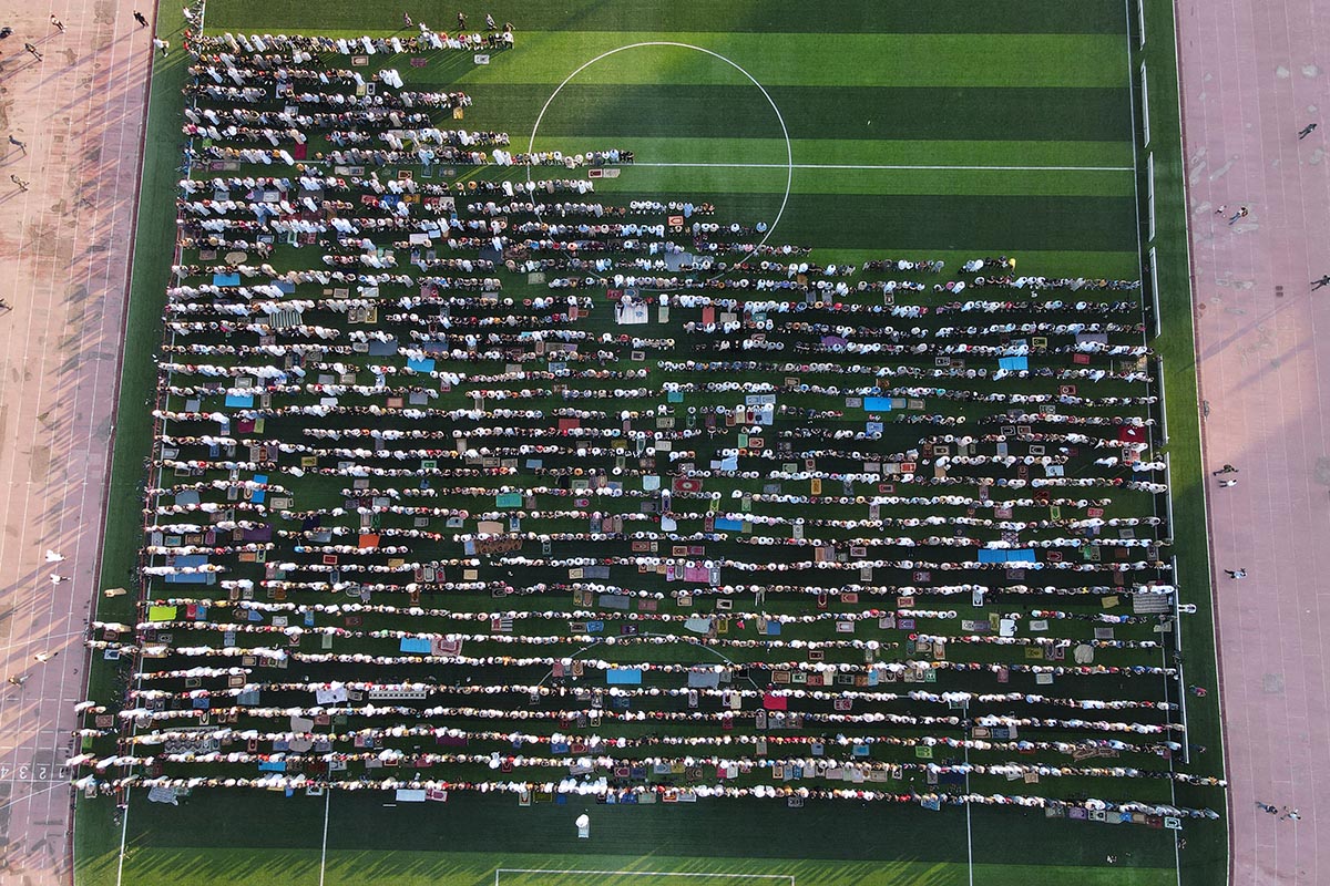 Musulmanes realizan sus rezos matutinos en el estadio municipal de futbol en Siria.