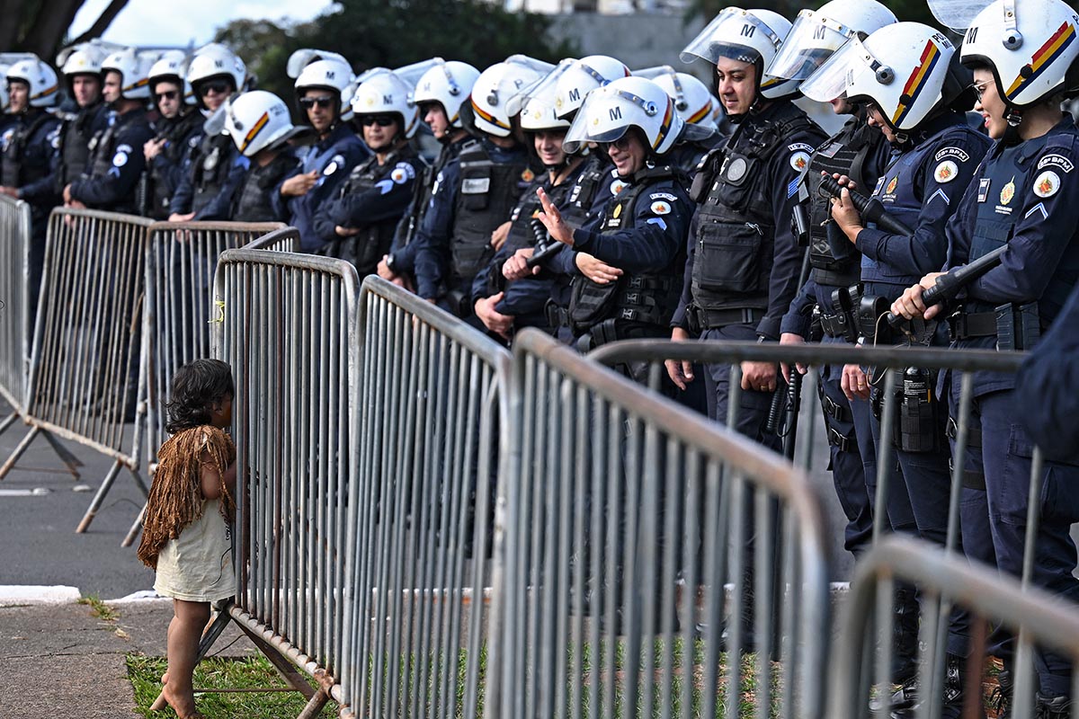 Un niño indígena habla con un grupo de policias durante la manifestación de la agrupación Tierra Libre en Brasil.