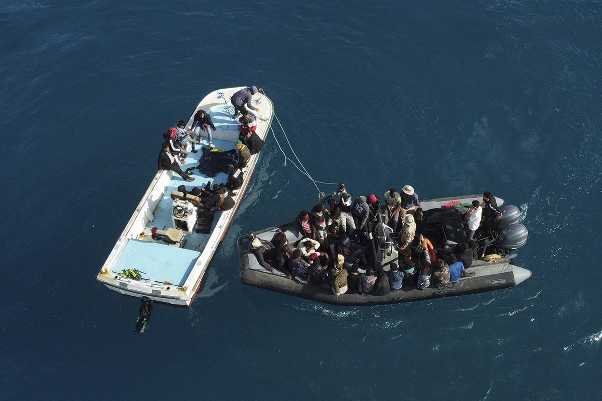 Un grupo de migrantes de diferentes nacionalidades son rescatados por la Guardia Costera de Libia.