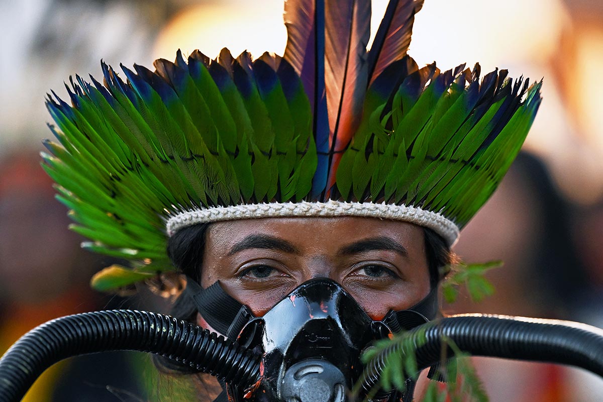 Una mujer indígena participa de la manifestación del movimiento Tierra Libre en Brasil.