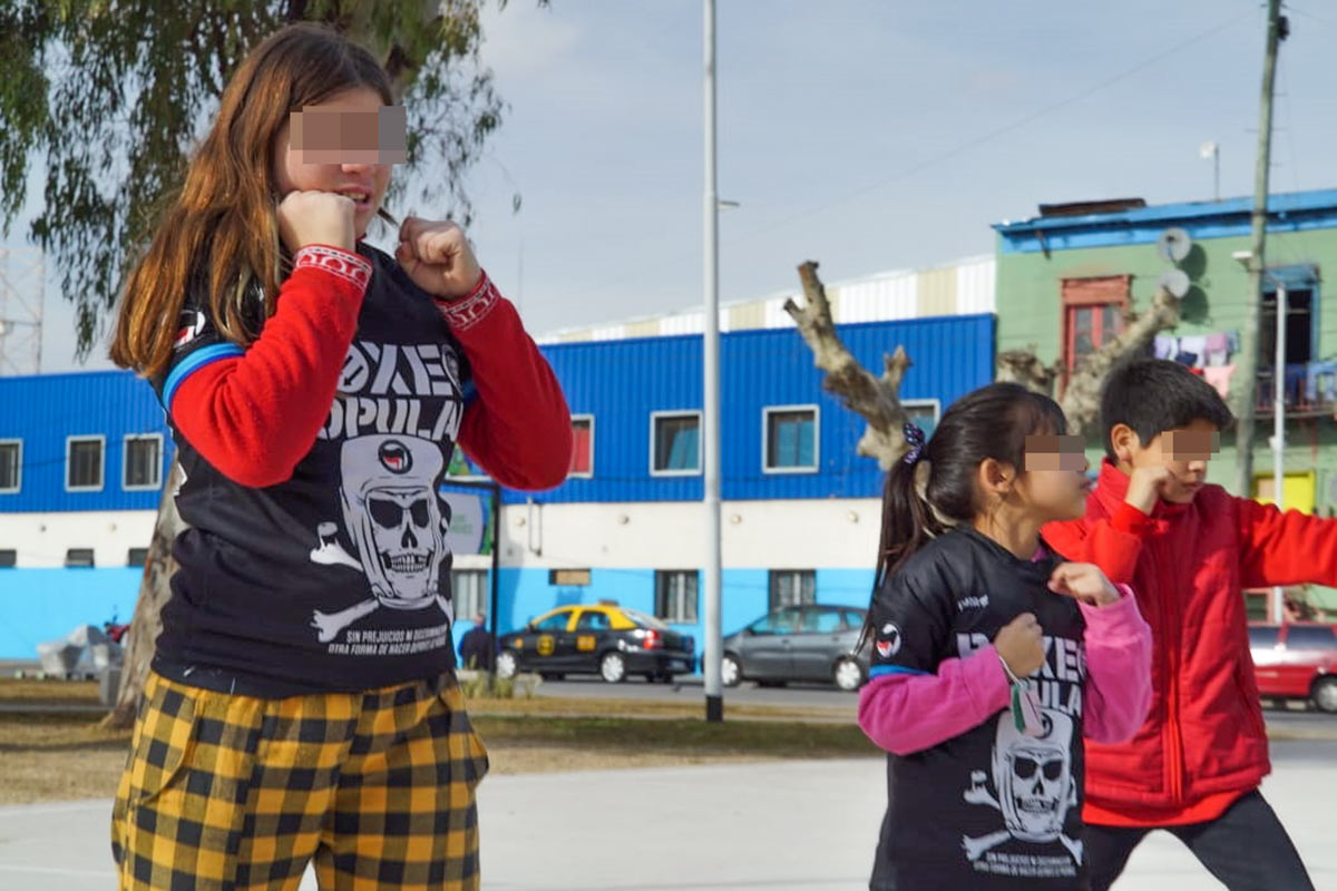 Boxeo Popular tiene tres años y todos los sábados junta entre 15 y 20 niños y niñas y alrededor de 20 adolescentes. “La idea es utilizar al deporte como un medio y no como un fin. Es un derecho que se brinda a niñes y adolescentes de forma gratuita. Al mismo tiempo se lo usa como un medio para poder laburar con los pibes, las pibas y sus familias, en relación a las distintas problemáticas de vulneración”, resume Laura. La iniciativa utiliza el boxeo como una excusa para afrontar temas más de fondo. “El objetivo es que se mantengan al margen del mundo de los adultos y que puedan superar problemáticas como violencia familiar, adicciones, bullying y otras cosas que pasan”.