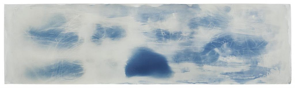 Una serie de piezas rectangulares, apaisadas, con manchas irregulares y una gradación que va del azul al gris, evoca distintos cielos: desde los más nublados y brumosos, hasta los más saturados amaneceres, con la insinuación de un sol naciente en el centro del cuadro. A estas fotografías Weber las denominó “Día peronista #1”, “Día peronista #2” …y están hechas sobre la base de los vidrios rotos del féretro de Perón. El artista tardó más de 14 años en acceder al material, que se encuentra bajo la tutela del juez que lleva la causa del “caso Perón” desde 1987. A partir de la técnica de la cianotipia, pudo reconstruir los quiebres e impactos que realizaron en el vidrio los profanadores de la tumba de Perón. “Hay algo en estas piezas que refieren, como un anzuelo, a que existe un vínculo real con esa violencia. Te permite verla de otra manera y reflexionar, desde un cielo azul hasta un cielo brumoso, sobre nuestra historia”, explica el artista plástico en diálogo con Tiempo Argentino.