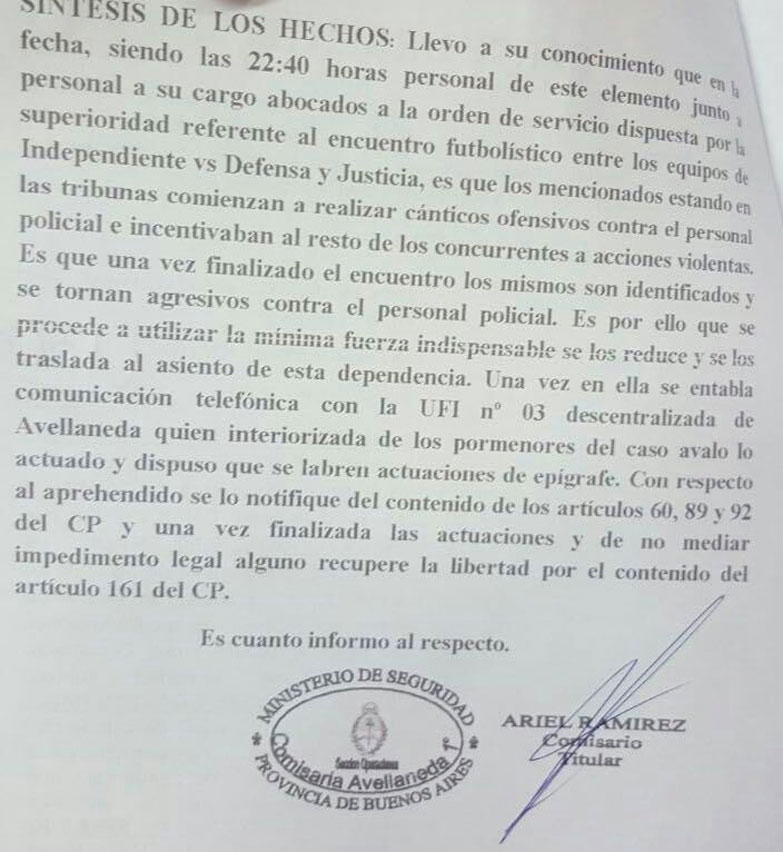 Según el acta que lleva la firma del comisario Ariel Ramírez, la detención se produce por «realizar cánticos ofensivos contra el personal policial e incentivar al resto de los concurrentes a acciones violentas. Una vez finalizado el encuentro los mismos son identificados y se tornan agresivos contra el personal policial. Es por ello que se procede a utilizar la mínima fuerza indispensable, se los reduce y se los traslada al asiento de esta dependencia».