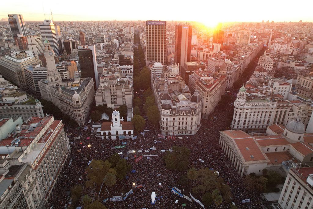 El centro de la Ciudad de Buenos Aires repleto con cientas de miles de personas en protesta por el recorte presupuestario del gobierno nacional a la educación pública superior.