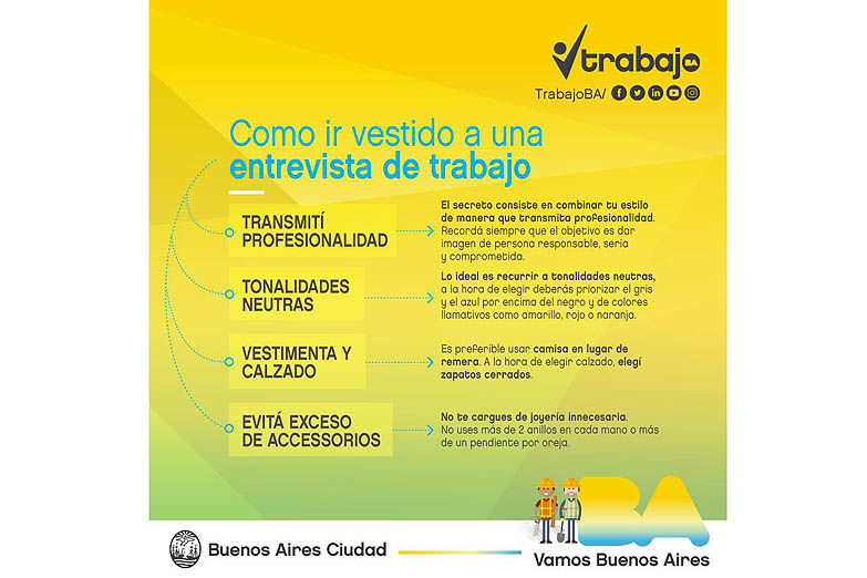 Aporta cuatro lineamientos generales, en un discurso donde tutea al lector, individualizándolo: transmití profesionalidad («recordá siempre que el objetivo es dar imagen de persona responsable, seria y comprometida»); tonalidades neutras («a la hora de elegir deberás priorizar el gris y el azul por encima del negro y de colores llamativos como amarillo, rojo o naranja»); vestimenta y calzado («es preferible usar camisa en lugar de remera. Elegí zapatos cerrados»); evitá exceso de accesorios («No te cargues de joyería innecesaria. No uses más de 2 anillos en cada mano o más de un pendiente por oreja»).