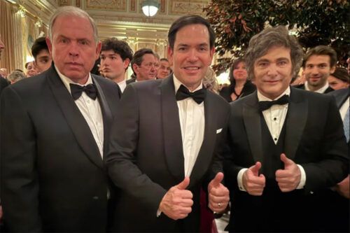 Del encuentro trascendió una fotografía en la que Milei y Rubio apuntan los pulgares para arriba, tal como acostumbra el jefe de Estado, que durante el viaje se ha tomado varias postales similares incluso con la directora del Fondo Monetario Internacional (FMI), Kristalina Georgieva.