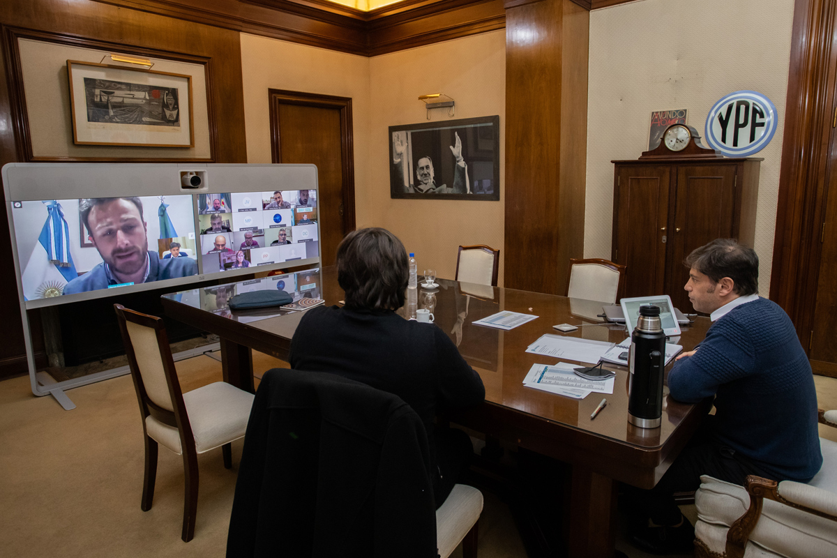 Kicillof estuvo acompañado por el jefe de Gabinete, Carlos Bianco, el ministro de Salud, Daniel Gollan, el viceministro de Salud, Nicolás Kreplak, y en forma remota por la ministra de Gobierno, Teresa García, y el ministro de Desarrollo de la Comunidad, Andrés Larroque.