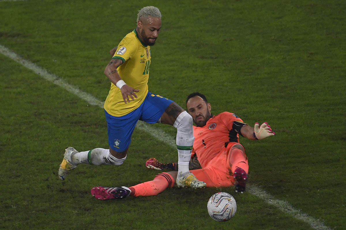 Brazil's Neymar (R) leaps over Colombia's goalkeeper David Ospina during the Conmebol Copa America 2021 football tournament group phase match at the Nilton Santos Stadium in Rio de Janeiro, Brazil, on June 23, 2021. (Photo by MAURO PIMENTEL / AFP)