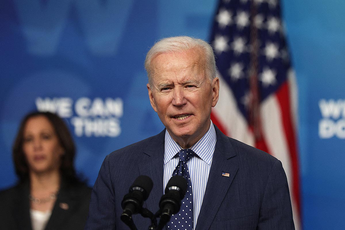 WASHINGTON, DC - JUNE 02: U.S. President Joe Biden (R) speaks as Vice President Kamala Harris (L) listens during an event in the South Court Auditorium of the White House June 2, 2021 in Washington, DC. President Biden spoke on the COVID-19 response and the vaccination program announcing new incentives including free beer, free childcare and free sports tickets to push Americans to get vaccinated before July 4th. Alex Wong/Getty Images/AFP (Photo by ALEX WONG / GETTY IMAGES NORTH AMERICA / Getty Images via AFP)
