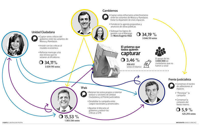 El día después de las PASO, el gobierno y la oposición comenzaron a delinear la estrategia electoral para retener los votos cosechados y ampliar la base de cara a la pelea de octubre que definirá la renovación parlamentaria. Los candidatos hicieron un balance de las respectivas campañas y comenzaron a escrutar con detalle de qué sector esperan capturar apoyos: el oficialismo mira a los espacios antikirchneristas de los votantes de Sergio Massa y Florencio Randazzo; CFK estudia a los votantes de esos mismos adversarios que se identifican con el PJ; su exministro analiza alternativas para retener la base cosechada; y el exintendente de Tigre actualiza y redefine el fallido discurso «del medio». Sin excepción, todos evalúan cómo atraer a los ciudadanos que votaron en blanco (3,46%) y a los 3 millones de bonaerenses que optaron por no concurrir a las urnas.