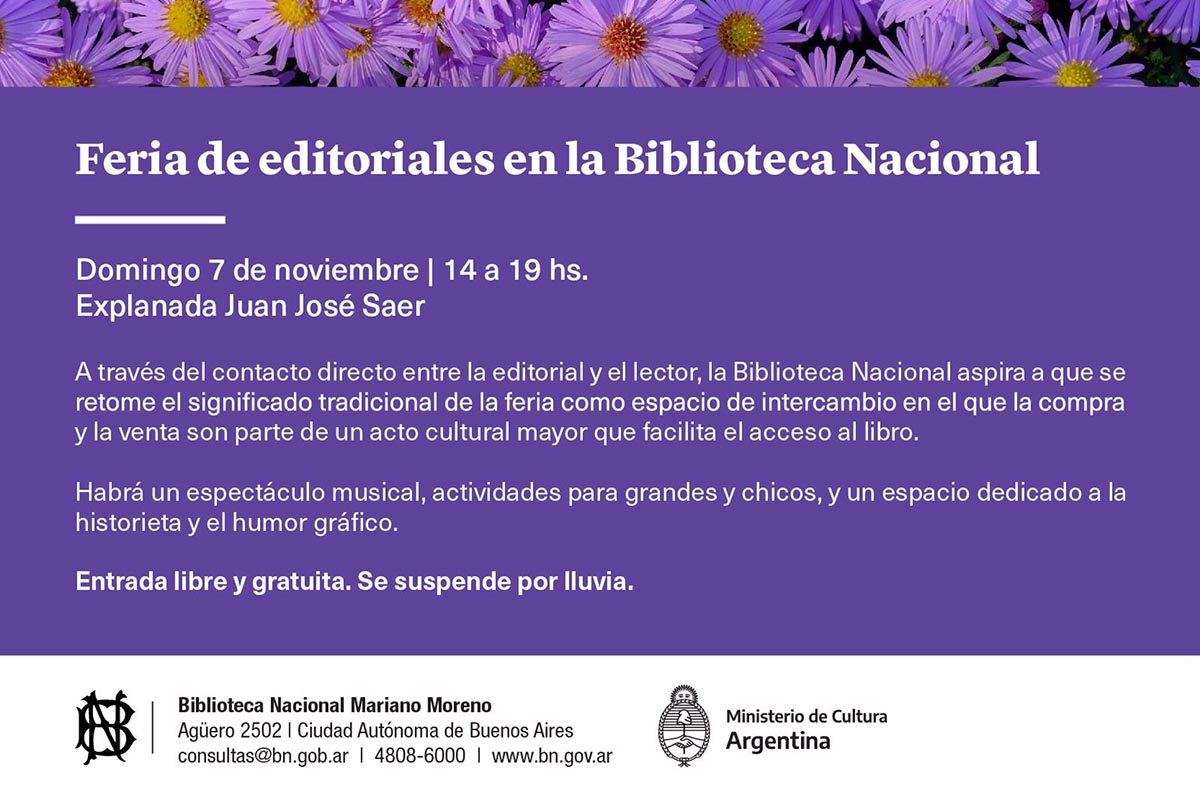 “Esta es la quinta edición de la Feria de Editoriales de la Biblioteca Nacional (BN)”, dice Jorgelina Núñez, responsable de su organización y editora en el área de publicaciones de la institución. En esta ocasión, la fecha se fue trasladando a la espera del levantamiento de las restricciones por la pandemia y eso nos obligó a que, de la Plaza del Lector, donde la hacíamos tradicionalmente, nos pasemos a la Explanada Juan José Saer, donde en este momento del año tenemos sombra. Este es un cambio importante porque la Plaza tiene más visibilidad. Pero que este domingo 7 de noviembre nos busquen en la Explanada, porque vamos a estar allí.”