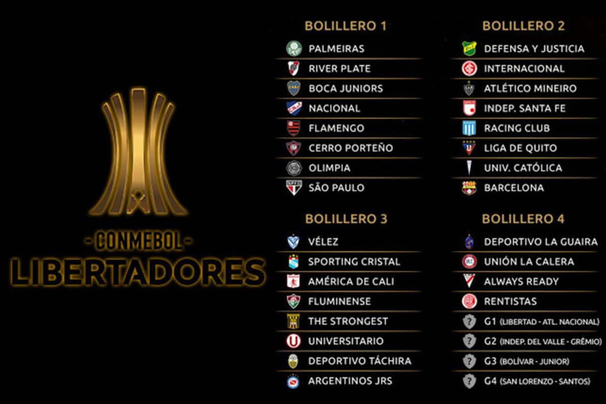 En la Libertadores, Boca podría compartir grupo con San Lorenzo, en caso de que el Ciclón elimine a Santos en la fase previa; River se medirá con Fluminense e Independiente Santa Fe; Racing medirá fuerzas con San Pablo; Vélez quedó en el grupo de Flamengo; Argentinos, en el de Nacional, y Defensa y Justicia jugará con el campeón vigente, Palmeiras.