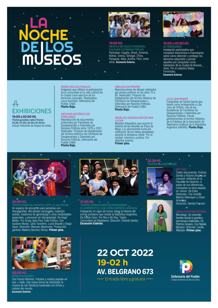 La Defensoría del Pueblo de la Ciudad de Buenos Aires será sede de La Noche de los Museos 2022 con distintas propuestas culturales y espectáculos para todas las edades. Obras de teatro, exposiciones de fotografías e ilustraciones y música en vivo son algunas de las actividades que desplegará este sábado 22 desde las 19 en su sede central ubicada en Av. Belgrano 673, con entrada libre y gratuita.