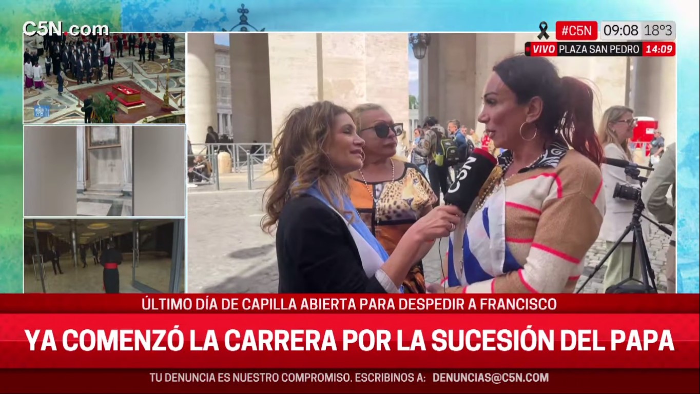 El viernes se la volvió a ver junto a otras dos personas que participaron de la despedida de uno de los pontífices más importantes en la historia de la Iglesia Católica. Esta vez, estaba acompañada por dos mujeres trans, que participaron de reuniones junto al Papa. La periodista Pamela Francescato, corresponsal de C5N dialogó con ellas, Marcela, de Uruguay y Laura de Paraguay.