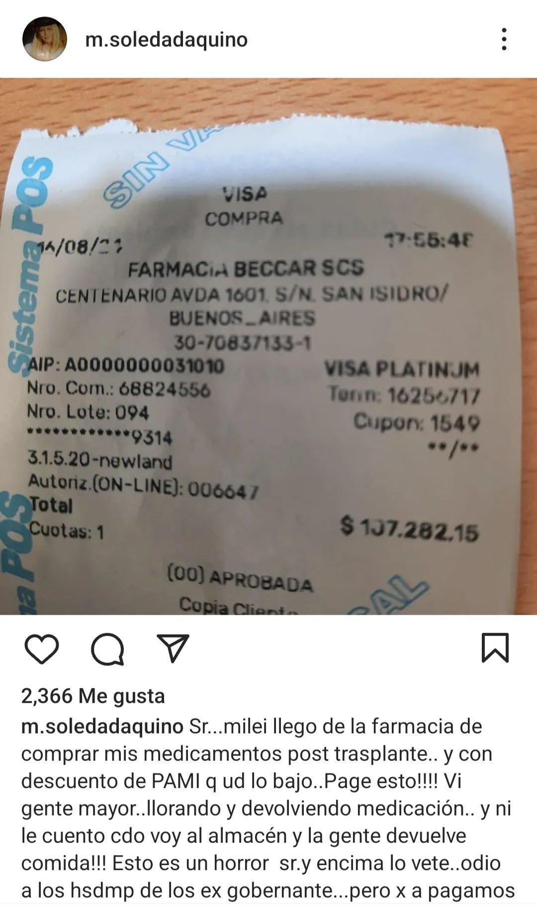 Soledad Aquino reclamó por algo que sufren millones de jubilados y afiliados a la obra social que desde agosto perdieron el descuento a remedios. Los valores superan los 100 mil pesos: «Vi gente mayor llorando y devolviendo medicación».