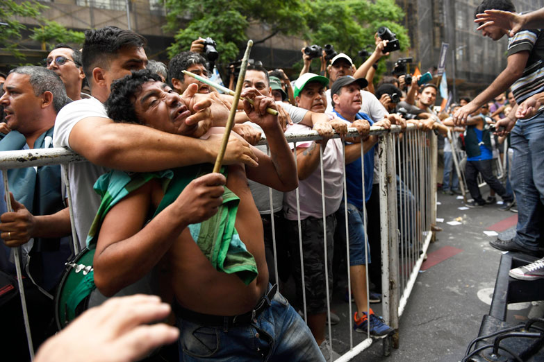 La escena no podía terminar bien. Y lo reflejó el final de la jornada: Acuña y Daer se retiraron casi corriendo por el sector trasero del escenario. Se fueron entre insultos, empujones, sillas que volaron por el aire, botellas de plástico que impactaban sobre la humanidad de custodios y afiliados fornidos que los protegían. Daer, bajo una catarata de cuestionamientos, insultos y gritos desencajados que expresaban desilusión, optó por refugiarse en la sede de la Federación Argentina de Empleados de Comercio y Servicios (FAECYS), en Diagonal Sur 644, bunker de su principal aliado, el influyente Armando Cavalieri.