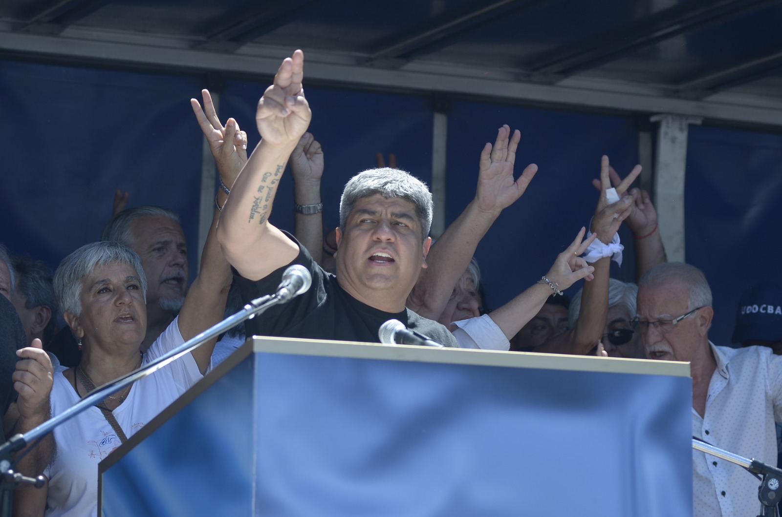 Hugo y Pablo Moyano, Héctor Daer, Hugo Yasky, Hugo Godoy, Alejandro Gramajo y la Madre de Plaza de Mayo «Taty» Almeida estuvieron presentes en el acto central, con duros cuestionamientos al gobierno nacional, así como a diputados y diputadas de la oposición por el reciente dictamen a favor de la ley que el oficialismo impulsa y busca aprobar.