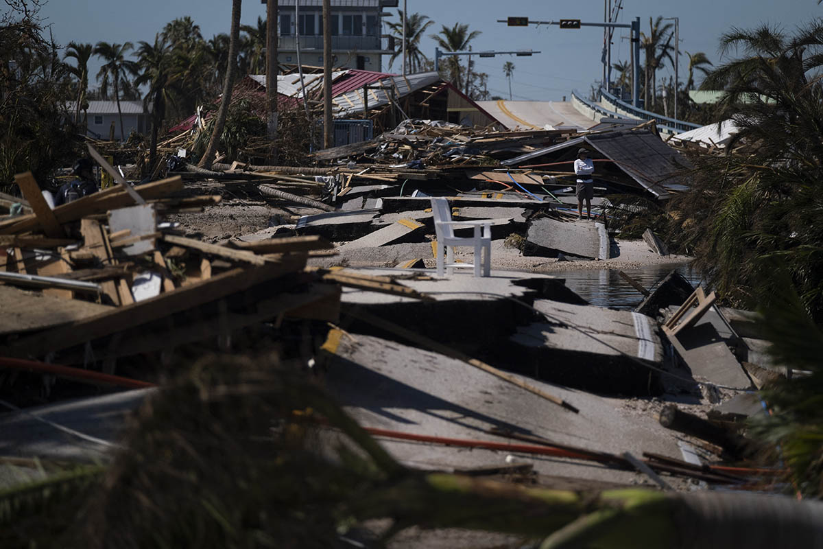 Un hombre observa los destrozos luego del paso del huracán Ian en Florida.