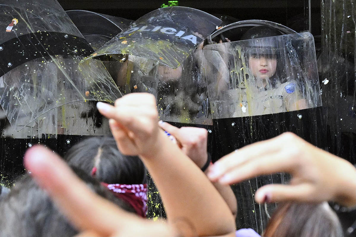 Un grupo de mujeres protesta frente a los cuarteles de la policia, luego de conocerse al asesinato de Maria Belén Bernal en Ecuador.