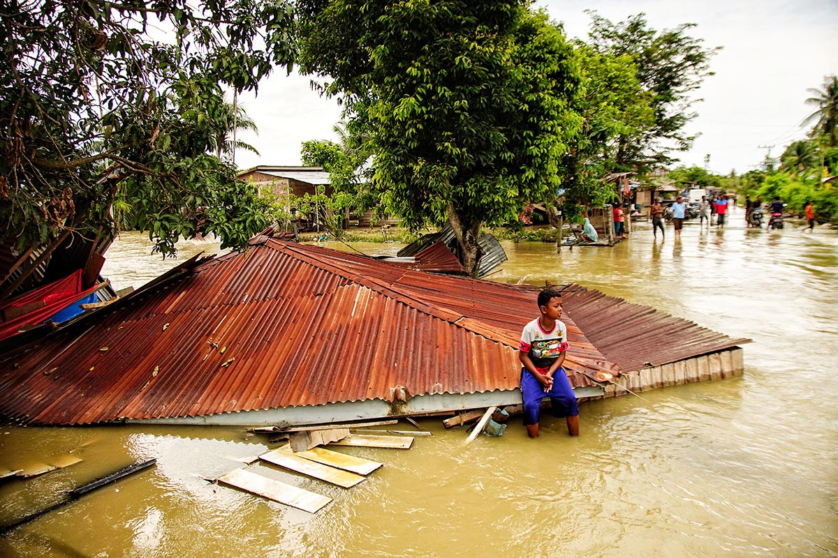 Un hombre se sienta sobre el techo de su casa durante las inundaciones en Indonesia.