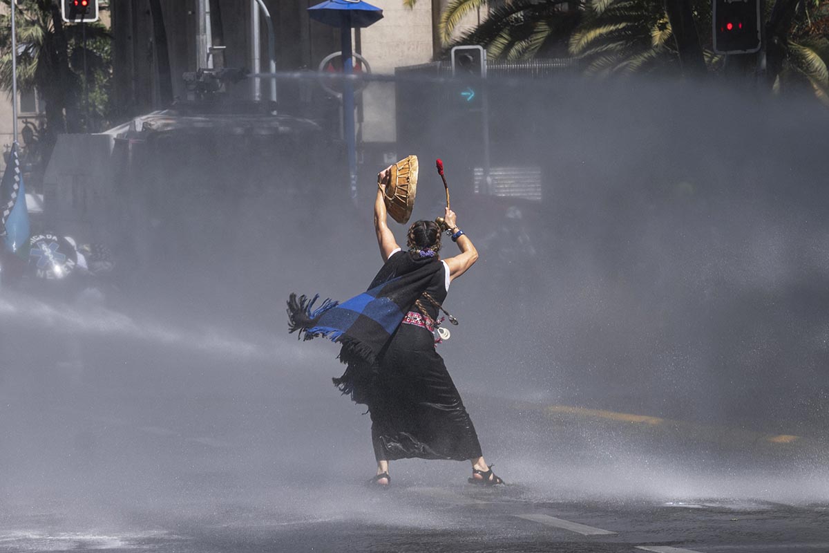 Una mujer mapuche durante las manifestaciones en el Dia de la Diversidad Cultural en Chile.