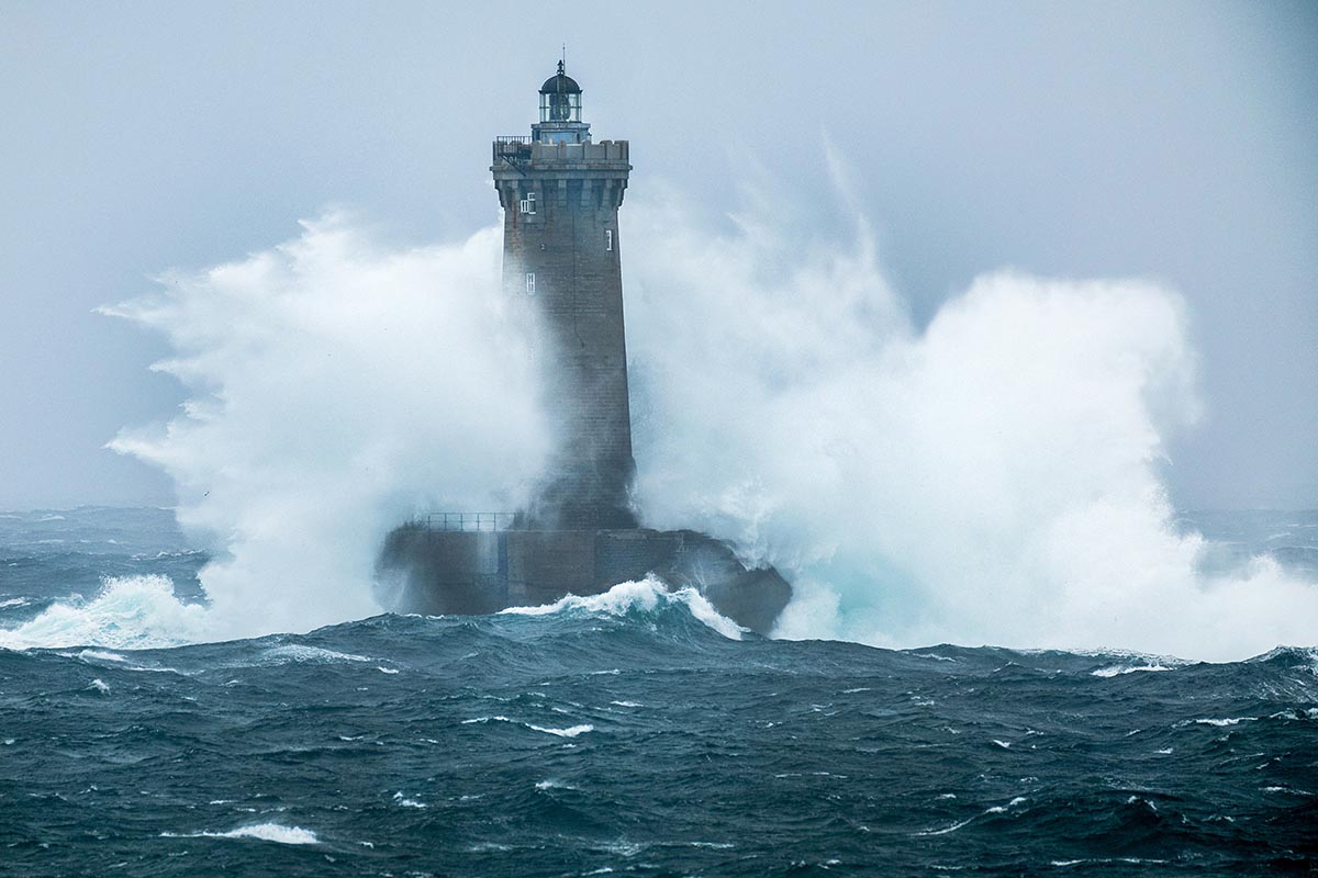 Fuertes olas golpean el faro de Porspoder en Francia.