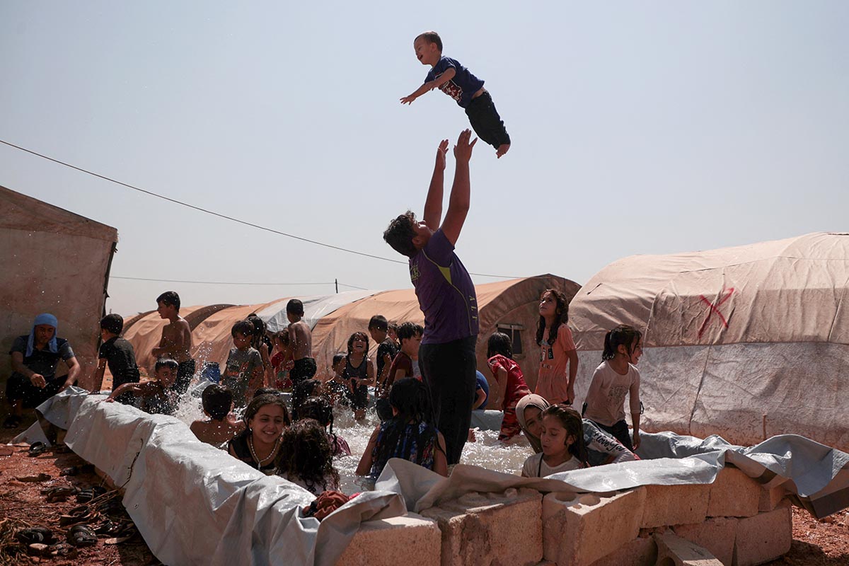 Varias familias se refrescan en una pileta en un campo de refugiados en Siria.