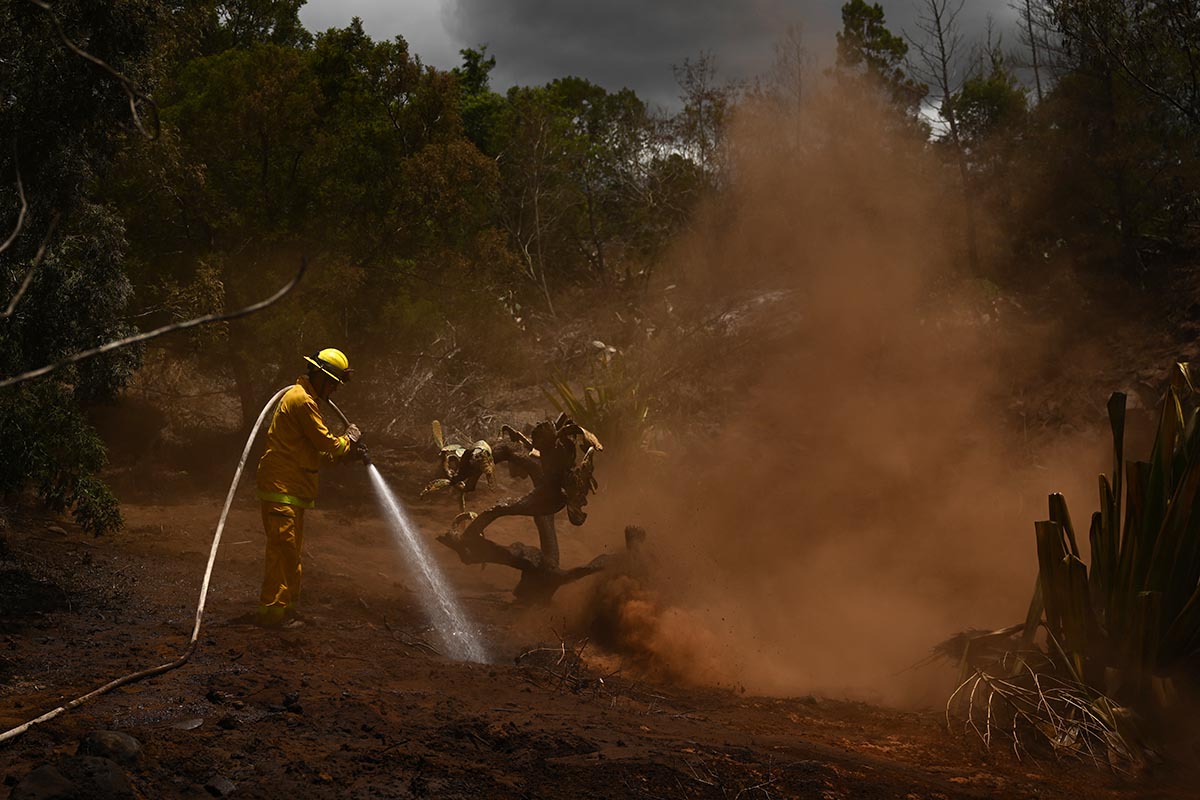 Un bombero apaga el fuego cerca de unas viviendas en la región de Kula, en Hawai.