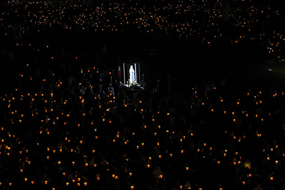 Peregrinos llevan una imagen de la Virgen Maria durante la procesión de antorchas en las celebraciones de la Asunción en Francia.